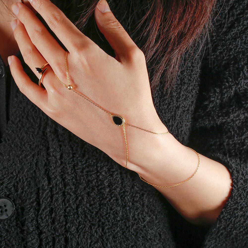 Enhance your outfit with this beautiful Gemstone Hand Chain Bracelet. Made with high-quality gemstones, this bracelet adds a touch of elegance and sophistication to any look. The hand chain design also adds a unique element to this piece, making it a must-have accessory for any jewelry collection.